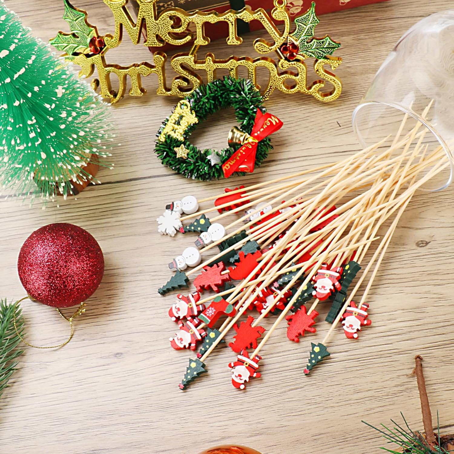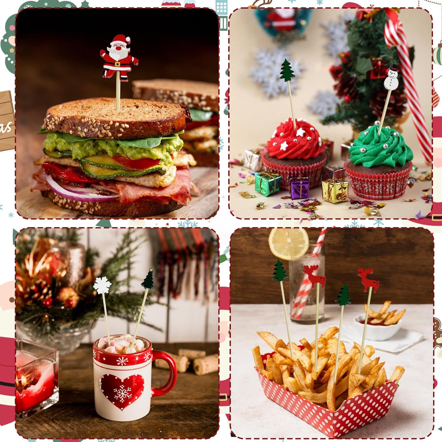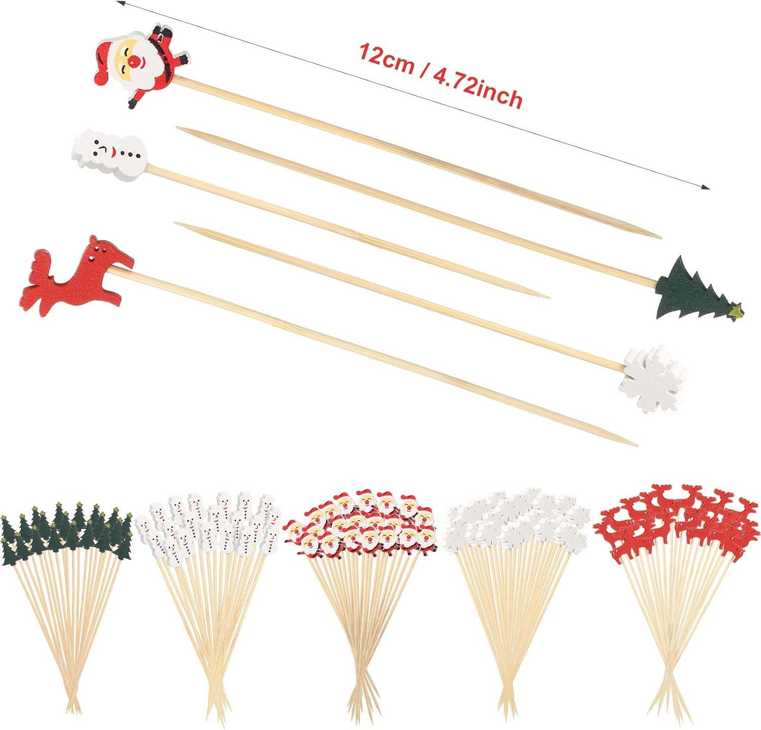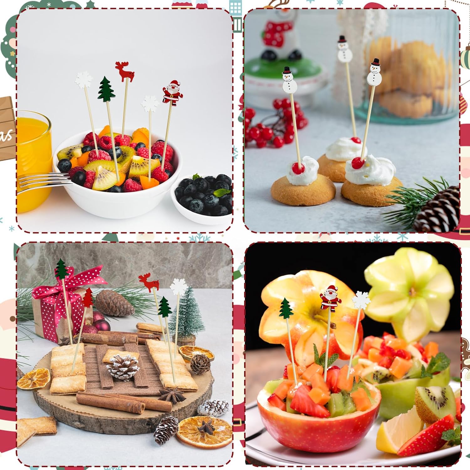- These Christmas food picks are adorned with a variety of charming Christmas designs, such as Christmas trees, snowmen, Santa Claus, and reindeer. Not only are they practical, but they also offer strong decorative appeal. They add a touch of holiday magic to your cocktails and appetizers, instantly elevating the festive atmosphere of any occasion.