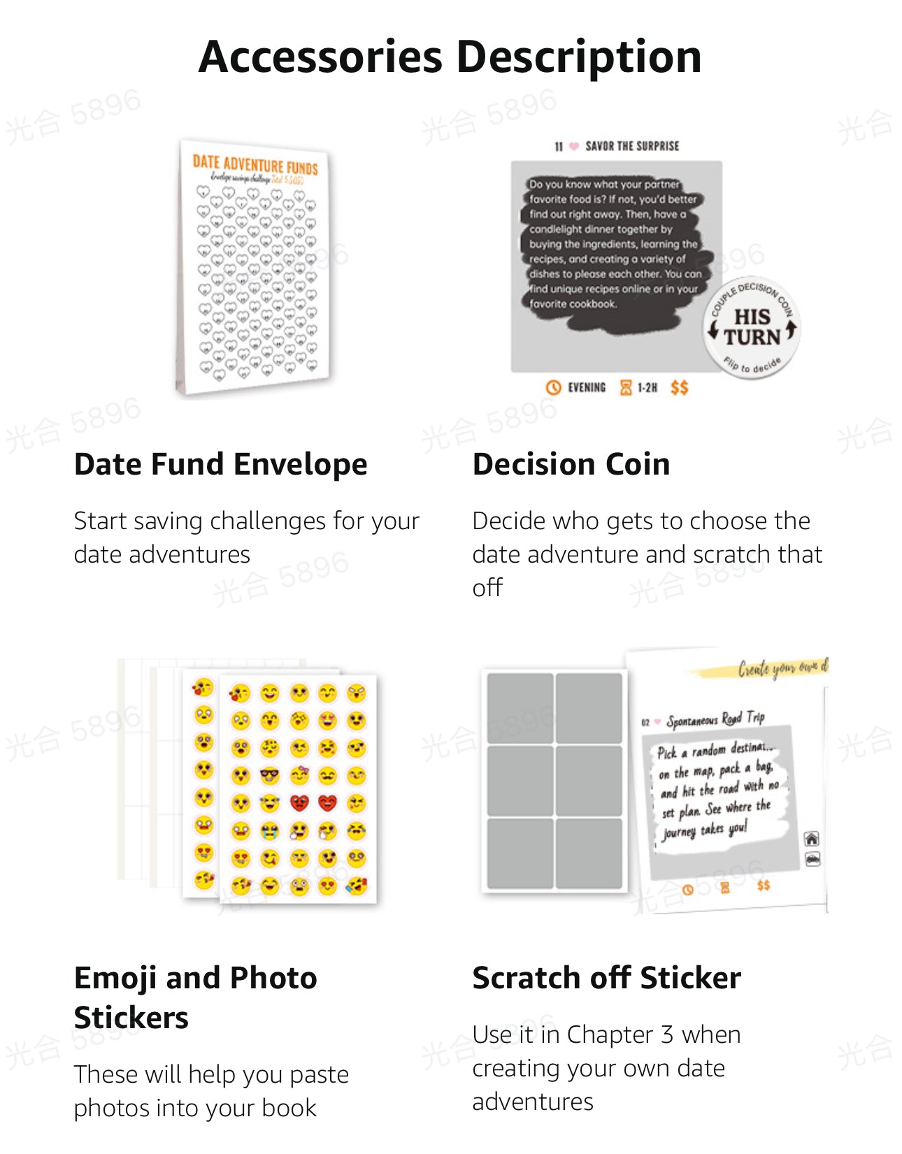 EASY TO USE: Each date night adventure scratch off has a theme, time, and cost guide, making it easy to choose the perfect activity. Includes fun couple quizzes and lots of accessories—decision coin, date fund envelope, and emoji stickers.